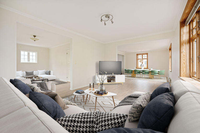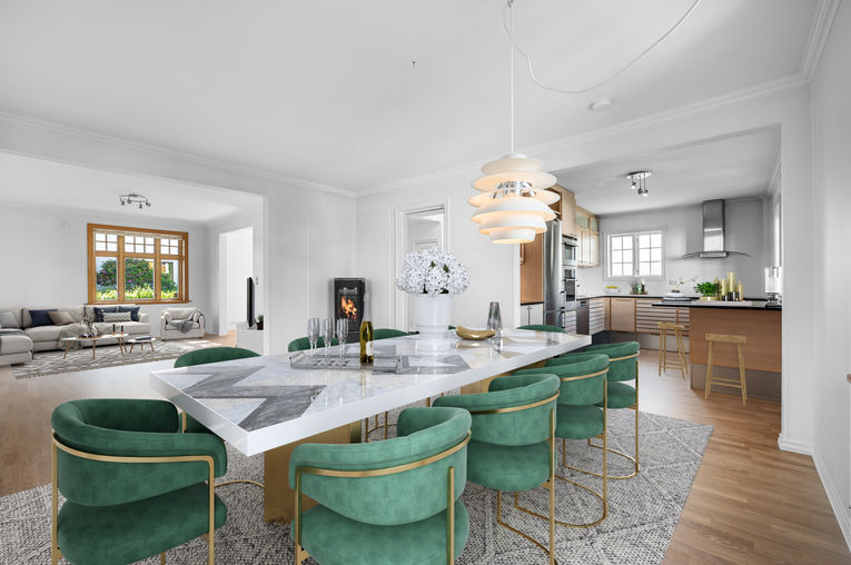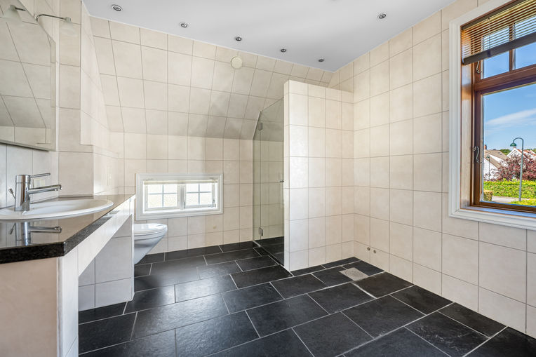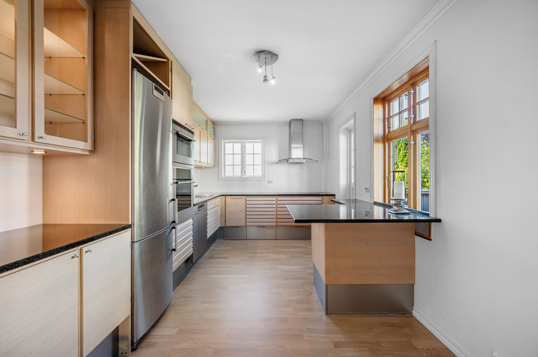 Stor og fin enebolig, nylig totaloppusset i 3 av totalt 4 etasjer. Boligen har 5 stuer, 4 bad – alle med dusj og toalett, et med stort badekar, 2 separate toaletter, 5 eller 6 soverom, moderne innholdsrikt kjøkken, kjølerom, 2 vaskerom og ekstra kjøkken i kjeller. Stor terrasse og hyggelig balkong. Hyggelig, pent opparbeidet hage. Garasje.